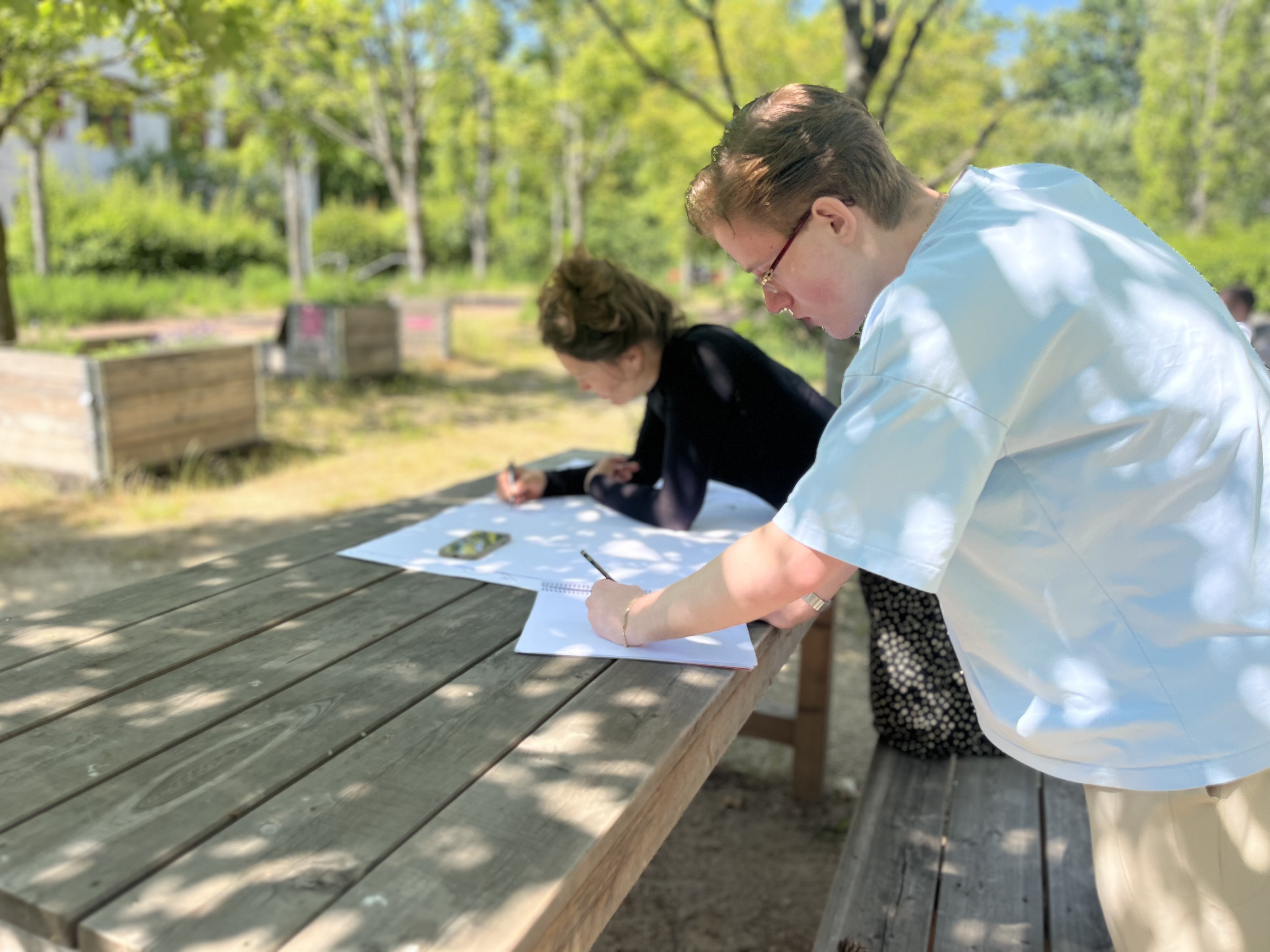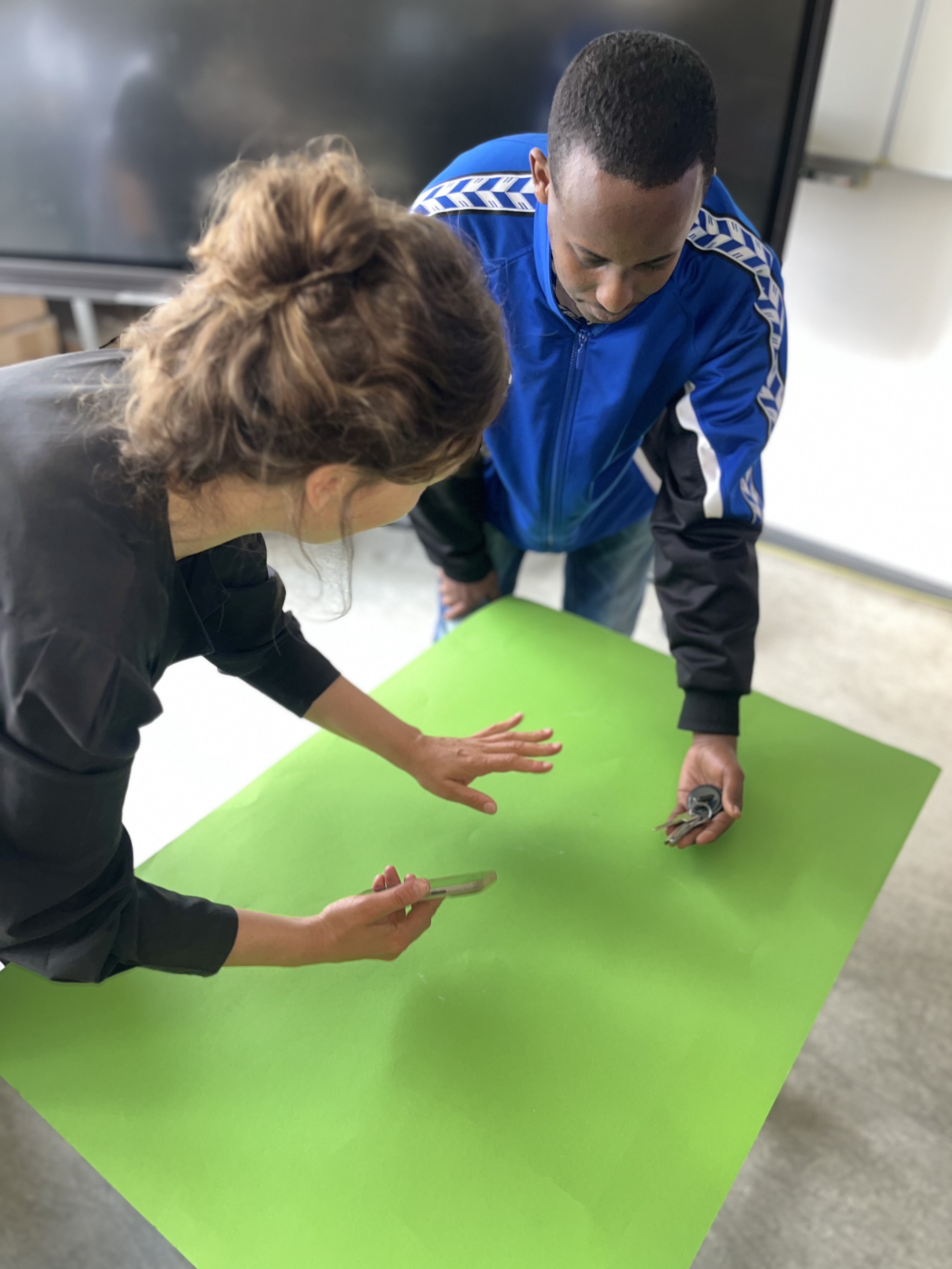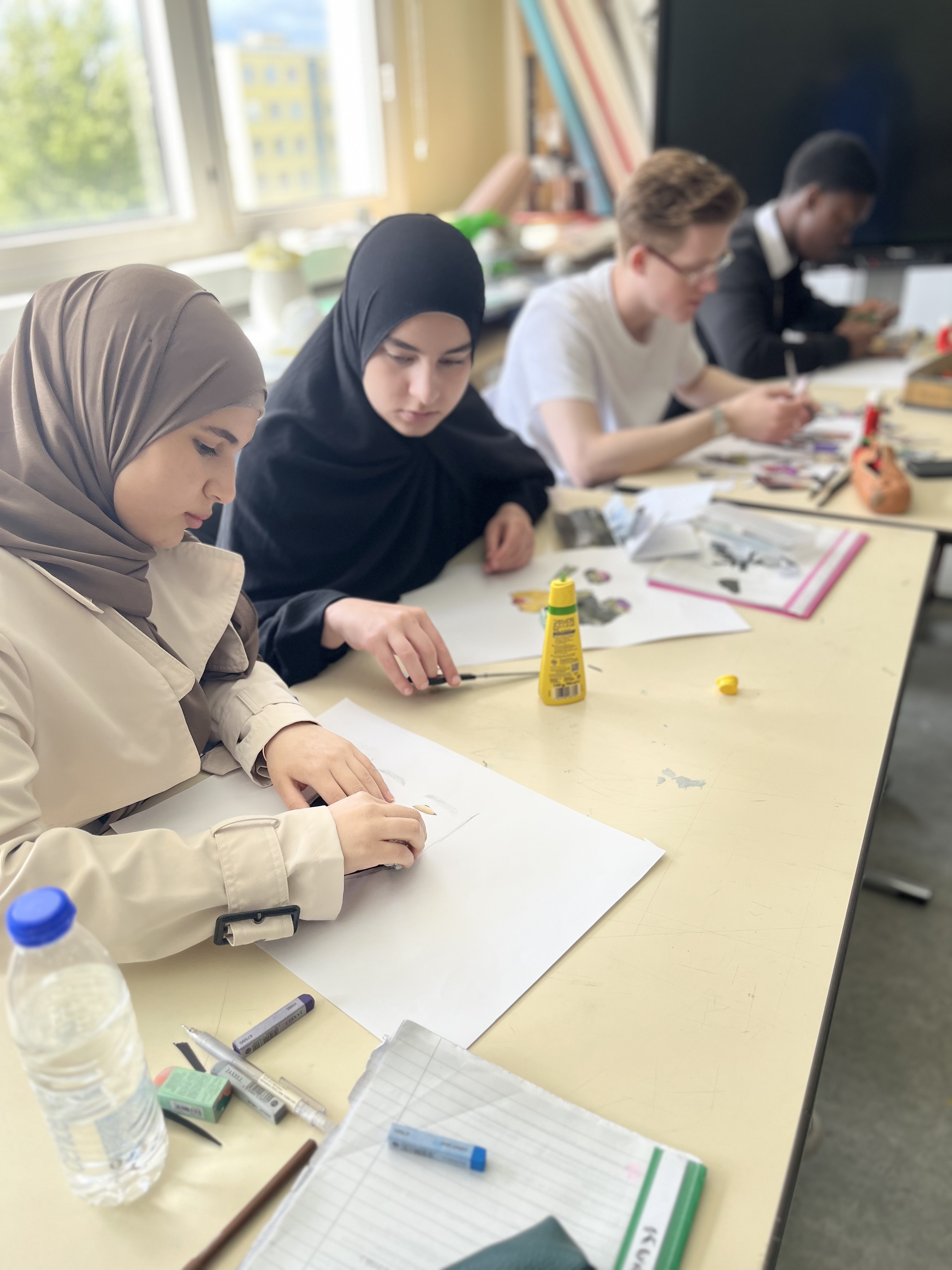 Schülerinnen und Schüler aus den Willkommensklassen und aus dem Basiskunstkurs der 11. Klassen am beruflichen Gymnasium und am OSZ-Lotis: Ahlam, Asen, Eliona, Faith, Fahad, Huda, Iman, Khalid, Lucy, Maria, Martyna, Mohammed Emir, Nawidullah, Nikita, Nisamadin, Paniz, Ronja, Sarina-Shalyn, Shahed, Teresa, Umut und Yannick.
